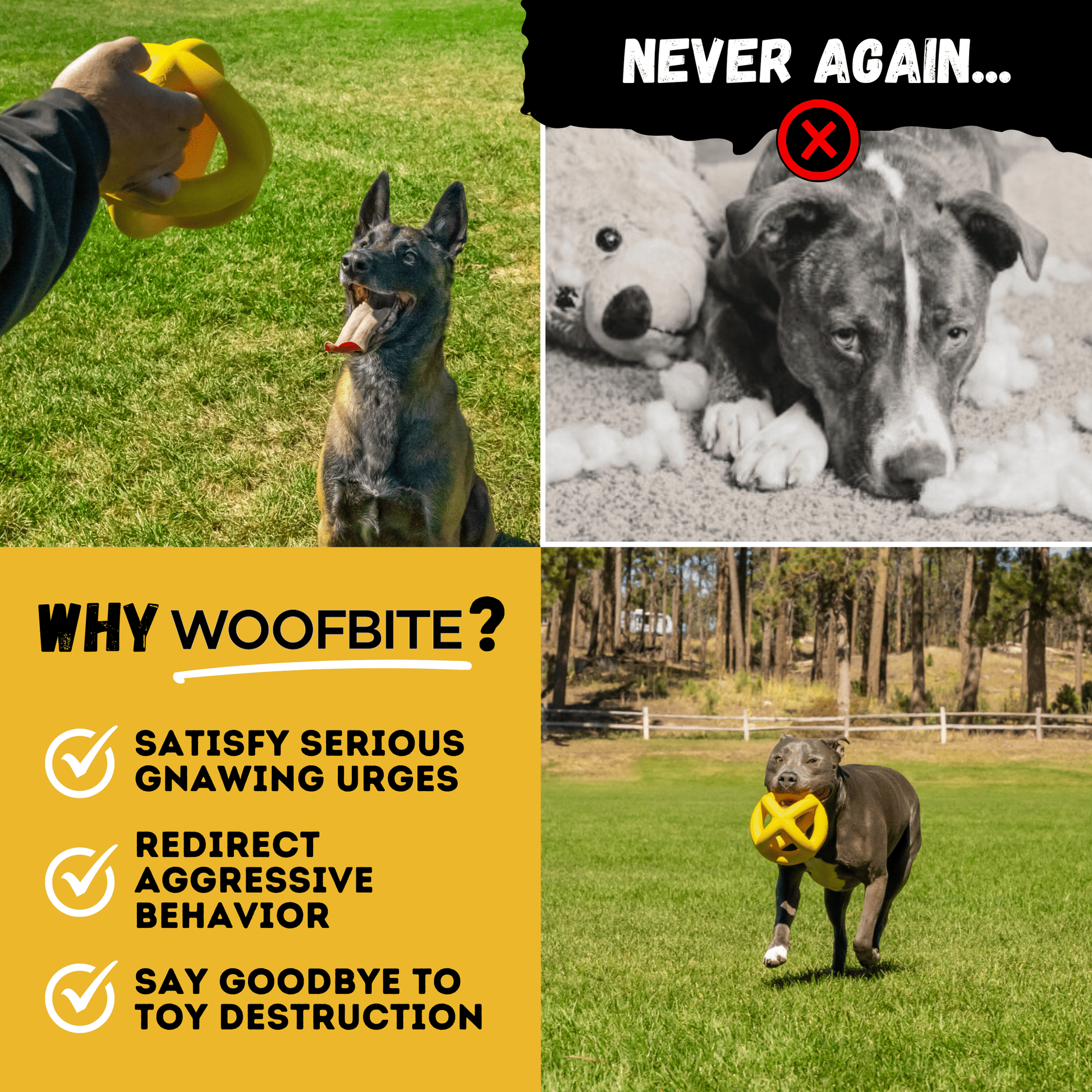 - Save Money on Dog Toys - Say goodbye to constantly buying new toys! WOOFBITE toys are chew-proof and built to last, outlasting other dog balls that get shredded in days. Our Demolish-Free Lifetime Guarantee ensures you only need to buy once. The only risk is not giving it a try.