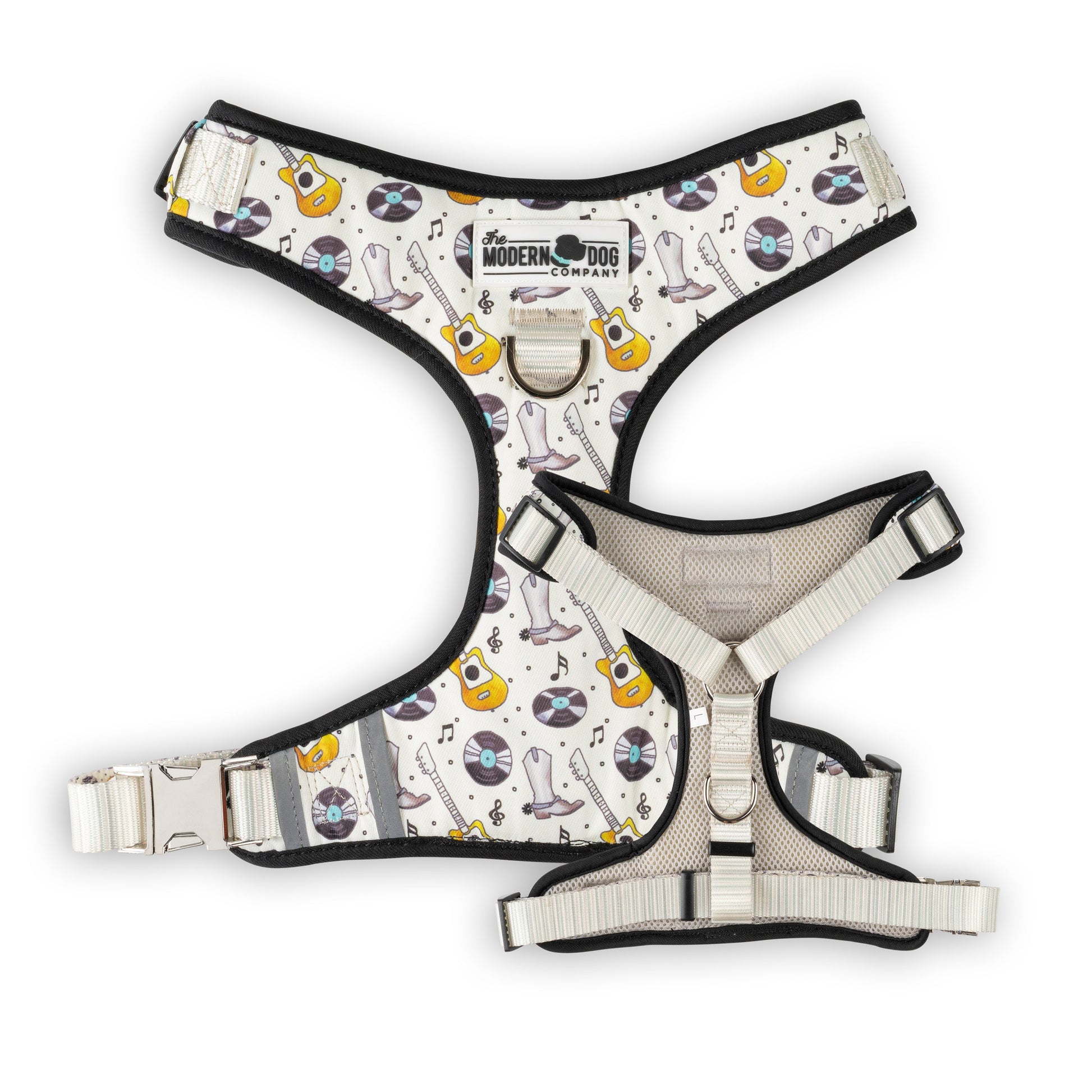 A tribute to the home of Modern Dog. The Music City harness is for all the dogs that like to sing along and four-step to their favorite songs. This print features some of Nashville's greatest treasures from vinyl records to guitars and of course, the classic Music City staple, cowboy boots.
